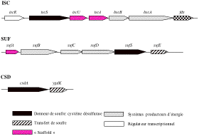 Les protéines fer-soufre sont des protéines essentielles qui contiennent dans leur site actif des assemblages d'atomes de fer et de soufre (centres fer-soufre). Les deux premiers systèmes découverts comme étant impliqués dans la biosynthèse des centres (FeS) chez Escherichia coli, les systèmes ISC (Iron Sulfur Cluster) et SUF (SUlFur), constituent de véritables machineries multiprotéiques. Elles assurent, tout à la fois, l'apport et le transport de fer, de soufre, la formation d'unités (FeS) au sein de protéines clé (les protéines « scaffold ») et le transfert de ces unités à des protéines cibles.