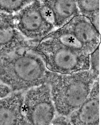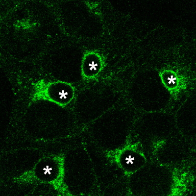 Ajout de 1 µM de CuSO4 au milieu de culture pendant 2 heures, puis de 10 µM de P3 pendant 3 heures. La protéine est à nouveau entre les noyaux et le canalicule. Le cuivre est donc retourné à son état basal grâce à P3.