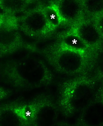 Ajout de 1 µM de CuSO4 au milieu de culture pendant 2 heures. La protéine encercle les canalicules et joue son rôle de détoxication en transférant le cuivre dans le canalicule.