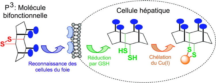 10) ; (ii) cibler les hépatocytes (P3 entre dans différentes lignées cellulaires) ; (iii) s’activer dans le cytoplasme (P3 ne fixe pas le cuivre en absence de réducteur) (