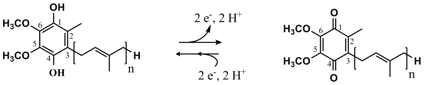 Lipide rédox. La chaîne polyprényle du coenzyme Q rend cette molécule lipophile. Q est une molécule qui a la capacité de passer d'une forme oxydée à une forme réduite, et donc de transférer des électrons entre les complexes enzymatiques des chaînes respiratoires (de la NADH-déshydrogénase et succinate-déshydrogénase vers la cytochrome c-réductase).