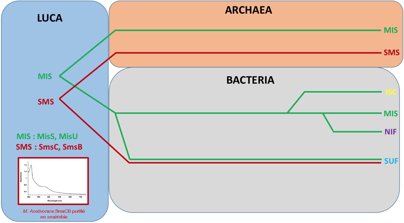 last universal common ancestor LUCA). Le LCBM (équipe BioCat) a caractérisé au niveau moléculaire par des approches de biochimie l’une de ces deux machineries (SMS), démontrant qu’il s’agit bien d’un système impliqué dans l’assemblage des centres Fe-S. Très anciennes, ces machineries MIS et SMS ont ensuite évoluées chez les bactéries pour donner naissance aux trois machineries NIF, ISC et SUF.