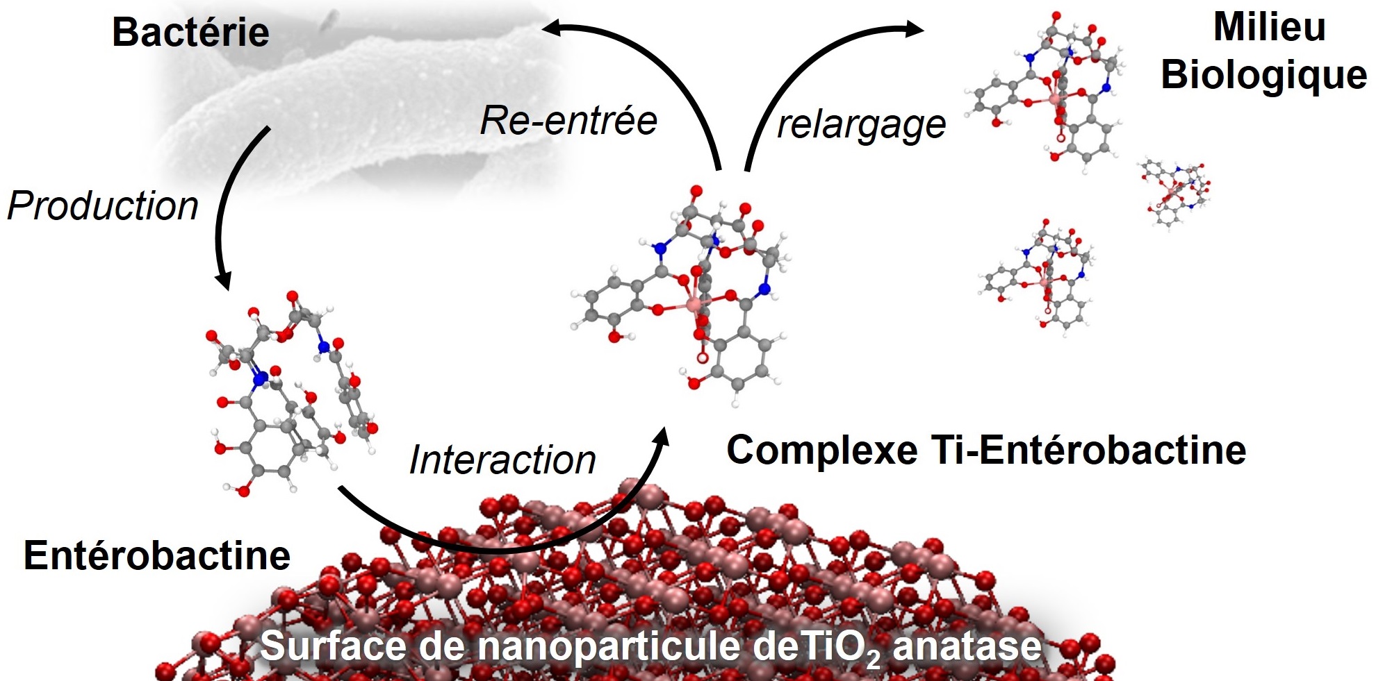 Pour la première fois, les études ont révélé que l'entérobactine se lie de manière covalente et forme des complexes avec le Ti(IV) dont le rayon ionique est presque identique à celui du Fe(III). De plus, le Ti(IV) a une affinité particulière pour les ligands oxygénés et pourrait entrer en compétition avec les métalloprotéines ou biomolécules oxygénées hexacoordonnées. Les chercheurs se sont donc intéressés à la liaison de l'entérobactine avec les nanoparticules de TiO2 qui pourraient ainsi se dissoudre. Ils ont montré que l'entérobactine en se liant à la surface des nanoparticules de TiO2 favorise la solubilisation du Ti(IV) par la formation de complexes Ti-ent. Cette dissolution dépend des propriétés intrinsèques telles que la taille, les défauts de surface et la forme cristallographique des nanoparticules.
