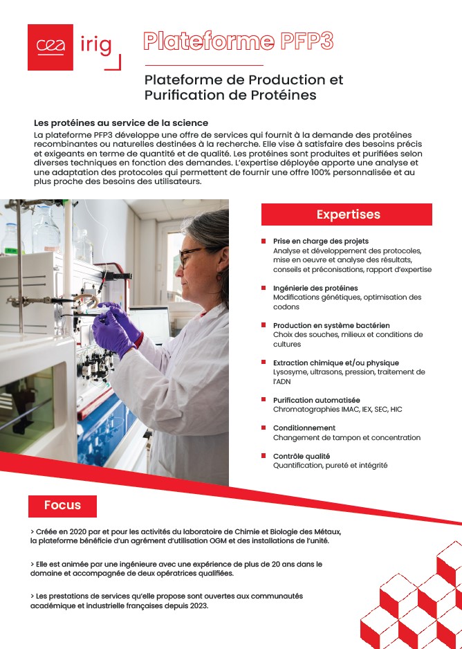 Créée en 2020 par et pour les activités du Laboratoire Chimie et Biologie des Métaux (LCBM), la plateforme PFP3 développe une offre de services qui fournit, à la demande, des protéines recombinantes ou naturelles destinées à la recherche. Pour répondre aux besoins spécifiques de chaque utilisateur, elle utilise des technologies avancées qui permettent de produire des protéines hautement purifiées et de qualité. Après plusieurs sollicitations, les services de la PFP3 sont devenus accessibles aux demandes extérieures au LCBM en 2023.