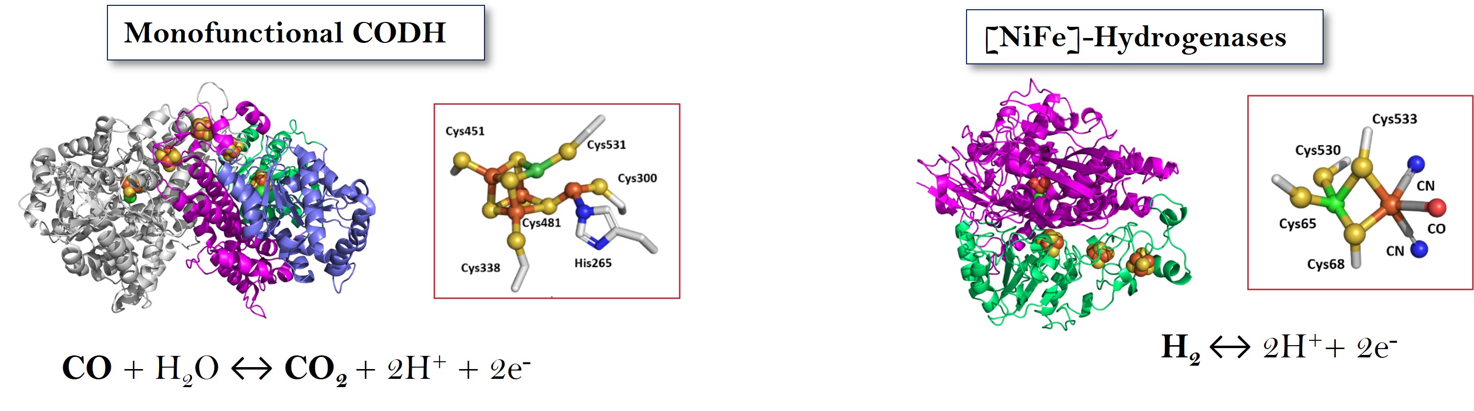 Currently, the industrial water-gas shift reaction (WGSR, CO + H2O-> CO2 + H2) is widely used for syngas upgrading. It is involved to modulate H2/CO ratios for the production of commodity products and liquid hydrocarbons. Hydrogenogenic carboxydotrophs are able to use CO as a sole energy source via the biological WGSR, which has the promise to become a green and cost-effective alternative to the industrial reaction. The biological WGSR is catalyzed by two enzymes, a monofunctional NiFe-carbon monoxide dehydrogenase (CODH) and a CO-induced energy-conserving NiFe-Hydrogenase (ECH). On a fundamental point of view, understanding the multi-enzymatic complexes involved in microbial CO metabolism is a challenge. Our model bacteria will be the mesophilic Rhodospirillum rubrum and the thermophilic Carboxydothermus hydrogenoformans.
