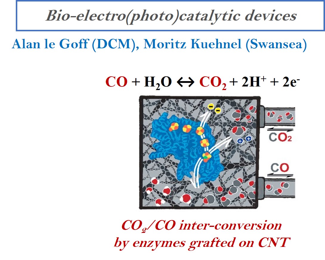 One main goal of the project is to propose a bio-electrocatalytic device to perform the reverse WGSR: Exploring the biodiversity, comparing the structures and functions of CODHs that have not been characterized before and using site directed mutagenesis to tune their properties will help identify new enzymes whose properties are better tuned for electrocatalysis. The most promising CODHs with be coupled with either hydrogenases or bio-inspired catalysts, to catalyse the reverse WGSR. These molecular nanomaterials will be integrated into (photo)-electrocatalytic reactors. In a second approach, we couple biomethanation (the production of biomethane by methanogens)and electrolysis (electromethanogenesis) to convert electricity, water and carbon dioxide into renewable methane. The design of MEC eliminates the necessity to produce H2 separately, overcoming at the same time the productivity limitations associated with low solubility and poor mass transfer of H2 in water. Main developments will be related to the design of specific electrodes and support of these electrodes to improve the mass transfer of the different species in liquid media.