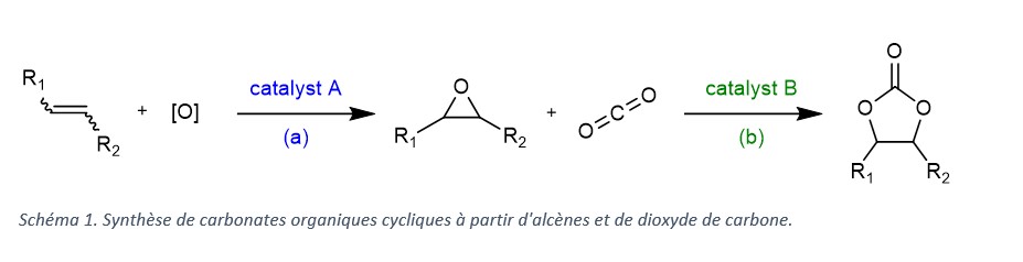 L. Albertin, C. Marchi-Delapierre, S. Ménage Cyclic organic carbonates (COCs) are stable, generally non-toxic liquid compounds that enable long-term CO₂ sequestration. Given that their synthesis is widely used in industry, as they can serve as solvents and intermediates in the manufacture of basic chemicals, converting captured carbon dioxide into COCs would significantly improve the cost-effectiveness of carbon capture and utilisation (CCU) technologies. In particular, the direct synthesis of COC from alkenes and carbon dioxide (oxidative carboxylation) has the advantage of using starting compounds that are less toxic, more readily available and less expensive than the corresponding epoxides. (Scheme 1).