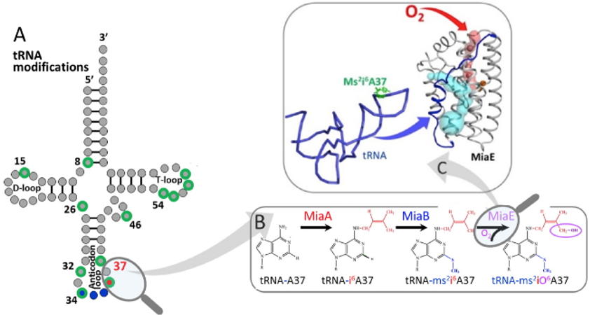in vivo activity shed light on the importance of an additional linker region for substrate tRNA recognition. Finally, krypton-pressurized Pp-MiaE experiments, revealed the presence of defined O