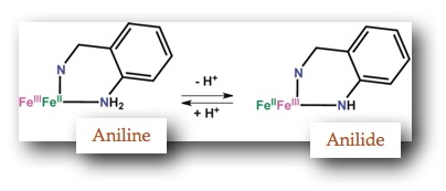 A major project of some researchers of our laboratory focuses on the electronic structure and reactivity of the dinuclear active sites of iron enzymes. In the course of these studies, a mixed-valent FeIIFeIII complex has been isolated (Figure 1) where the FeII ion (drawn in green) is bound by an aniline ligand whose nitrogen (N20) is doubly protonated.