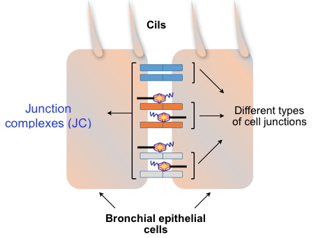 Bronchial epithelial cells play a central role in maintaining a tight and selective physical barrier by setting up structures called "junction complexes" (JC; see figure), located between the cells. This barrier protects the respiratory tract against pollutants, allergens, fine particles and microorganisms. In infectious and inflammatory pneumopathies such as cystic fibrosis, excessive permeability of this pulmonary epithelium is observed. The molecular mechanisms underlying the increased permeability are poorly understood and deserved to be investigated.