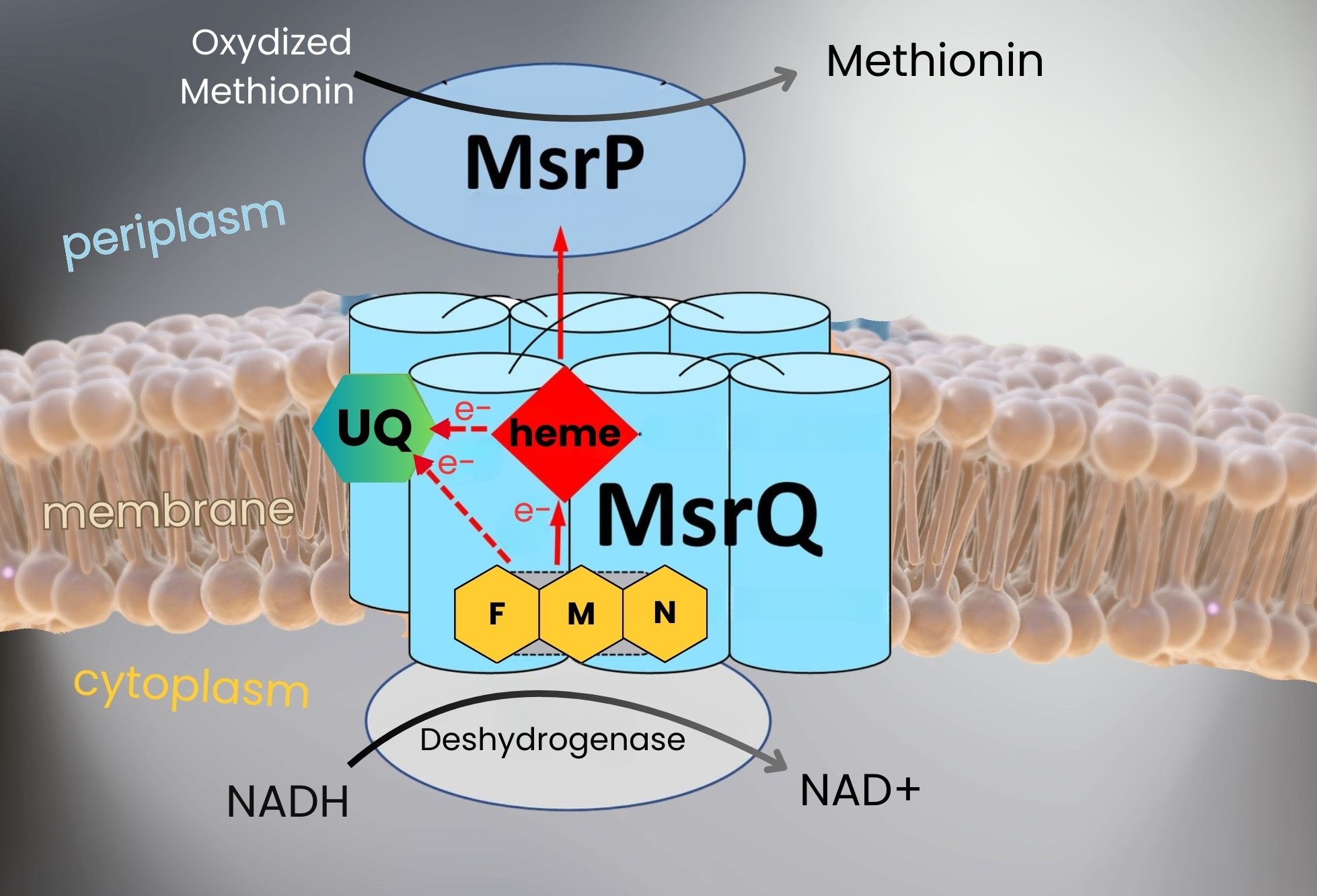 Using complementary approaches (directed mutagenesis, electron paramagnetic resonance spectroscopy, electrochemistry, high-performance liquid chromatography coupled with mass spectrometry, and AlphaFold), researchers at LCBM/BioCat were able to study the mechanism of MsrPQ in detail, particularly the central role of its membrane component MsrQ, which catalyzes a specific electron transfer reaction from the cytoplasmic space to the periplasm. In addition, they identified that MsrQ contains, in addition to
